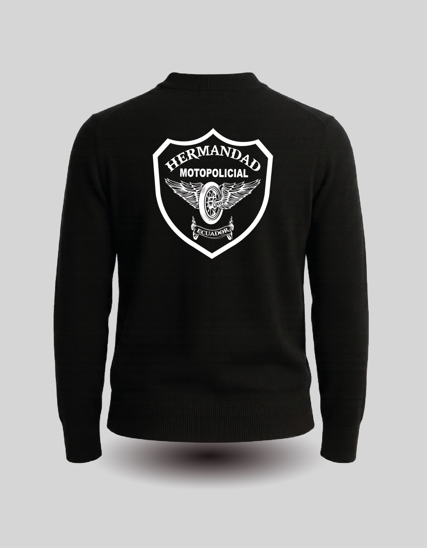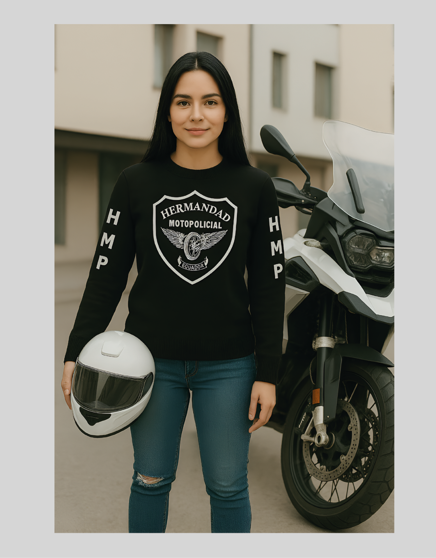 Buzo color negro, poli algoón cuello tipo tortuga logo HMP en el frente y HMP en las mangas.